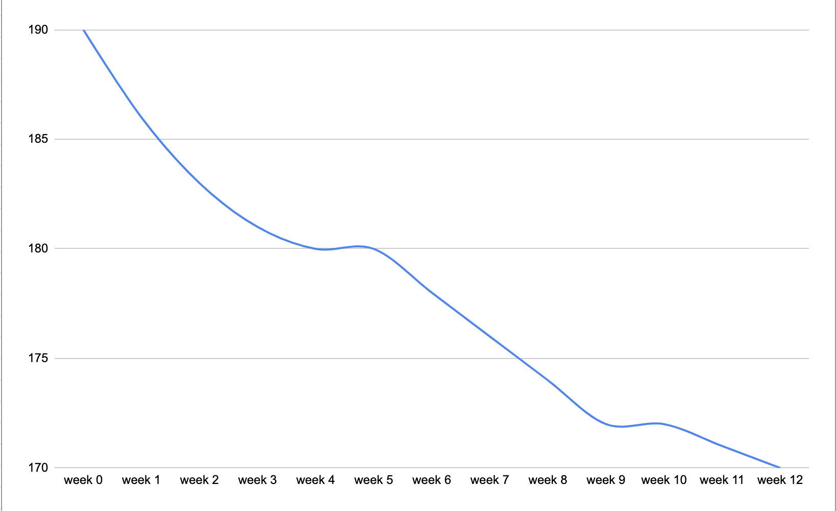 目标体重是170磅,减20磅大概在10周到12周,3个月时间。可能出现2~3个平台期。 平台期可能出现在第四周和第9周。原因是体重的下降会导致新陈代谢的下降。 在平台期,需要重新评估减肥方案,饮食方案。但愿可以早日走出平台期。